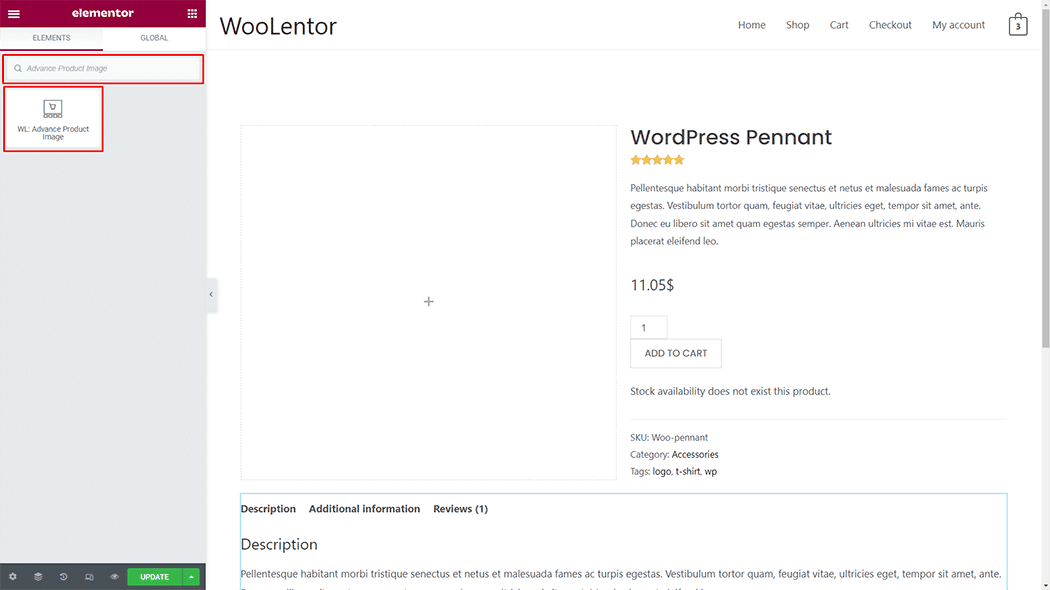 If you want to leverage the Advance Product Image feature on your WooCommerce store, you will need to use a widget named “Advance Product Image“. To do so, simply search the widget in the Elementor widget panel, and use it on the corresponding template that you have created for the Single Product Page. Check out the process to easily understand how to add the Advance Product Image, see the GIF image or follow the manual steps below.
