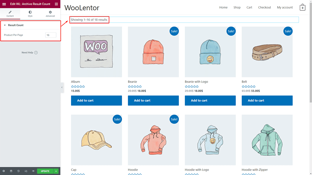WooLentor “Archive Result Count” widget is a very handy widget you can use for your archive and shop page. With this widget, you can display the number of products on your archive or shop page to the shoppers.