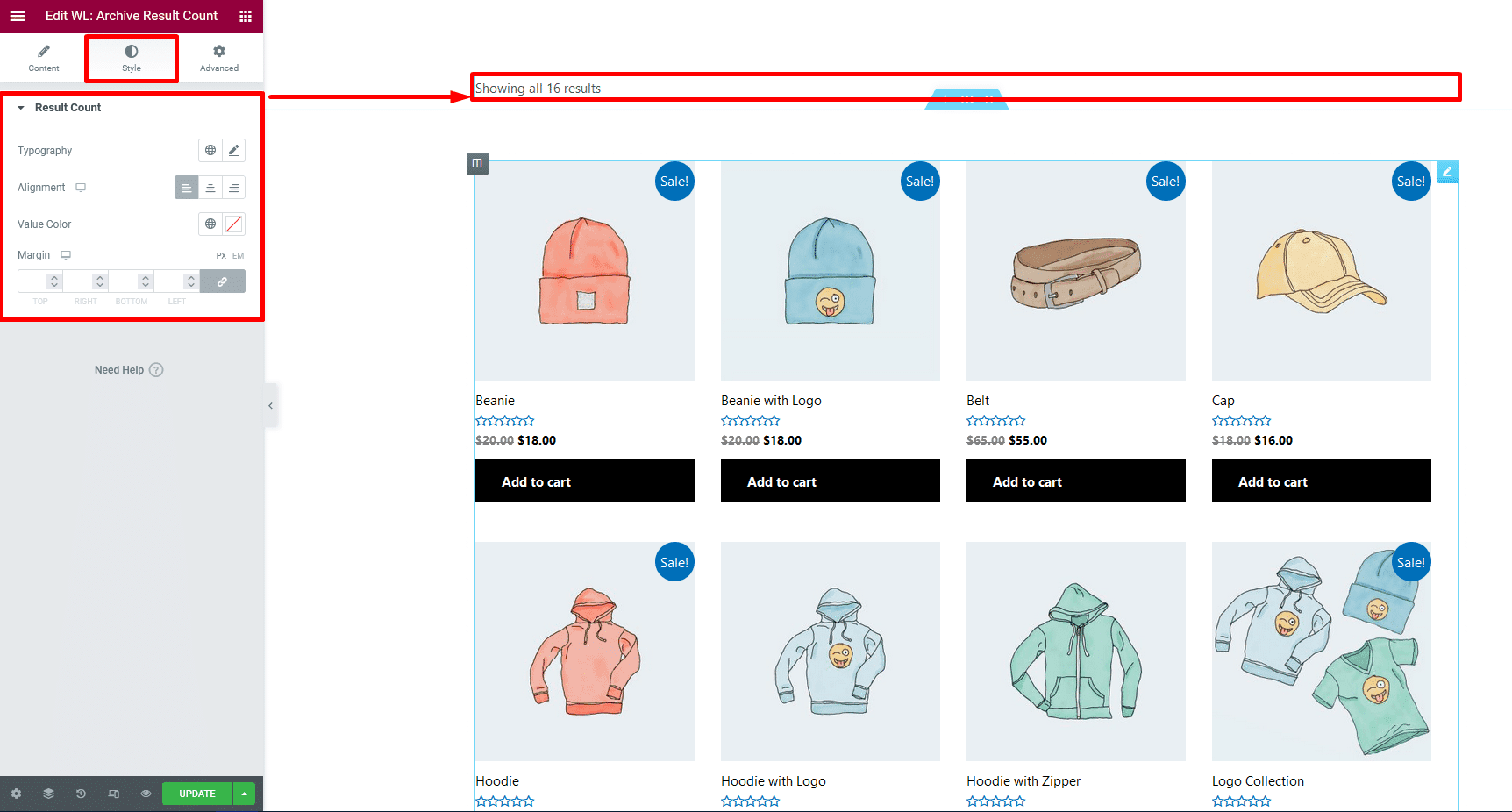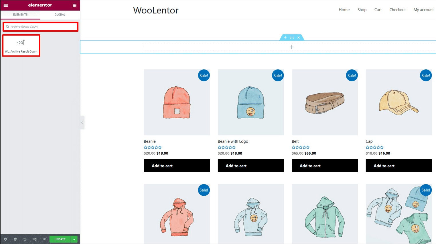 Drag and drop the WooLentor “Archive Result Count” widget onto the Archive Page Template.