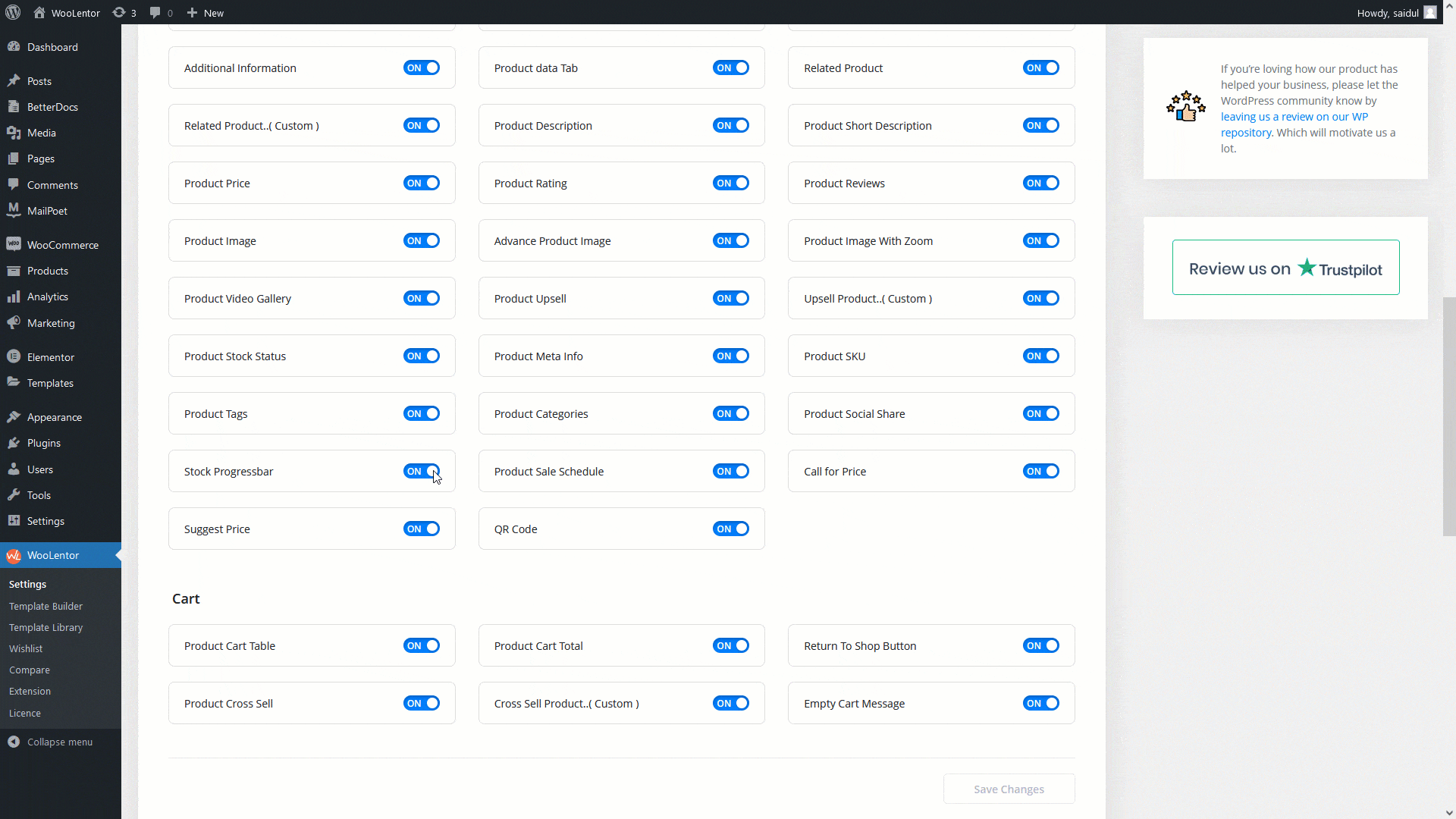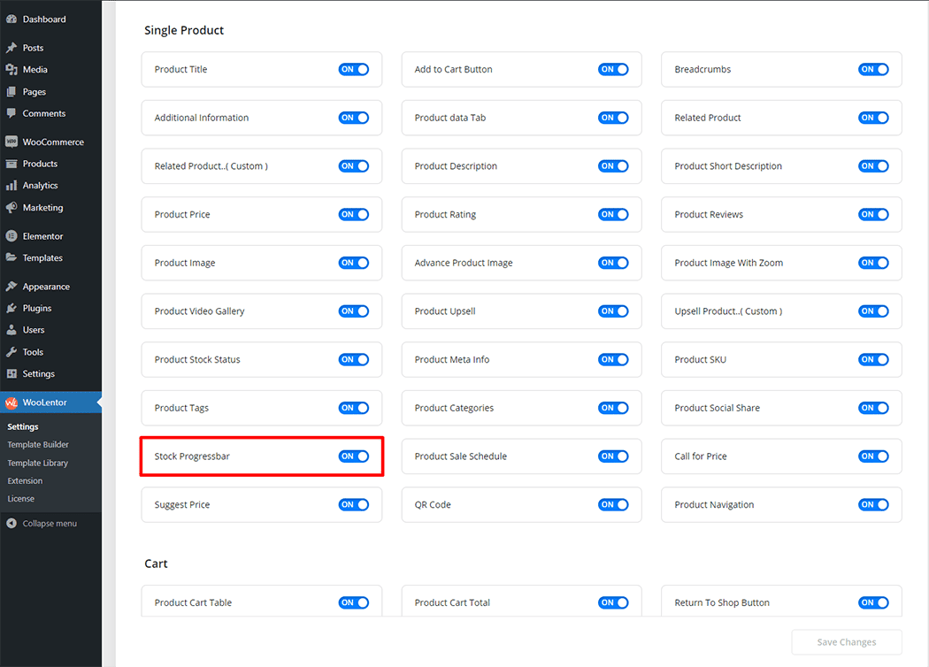 Go to WordPress Dashboard > WooLentor > Settings > Elements. From the list of Elements, turn ON the “Stock Progressbar” widget.