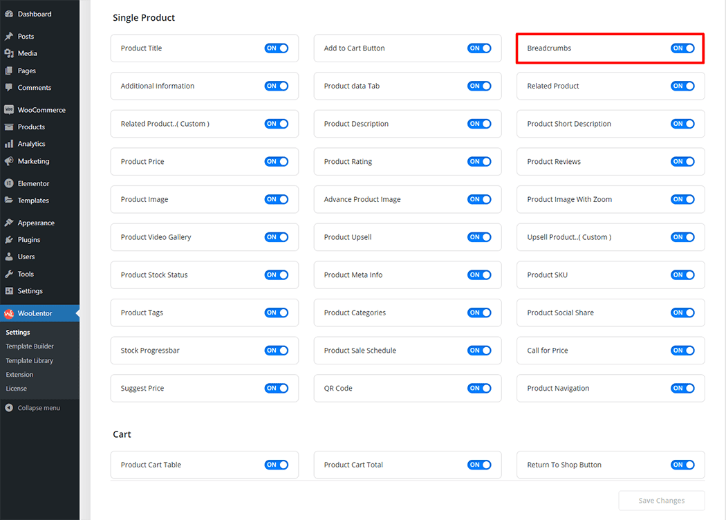 Go to WordPress Dashboard > WooLentor > Settings > Elements. From the list of Elements, turn ON the “Breadcrumbs” widget.