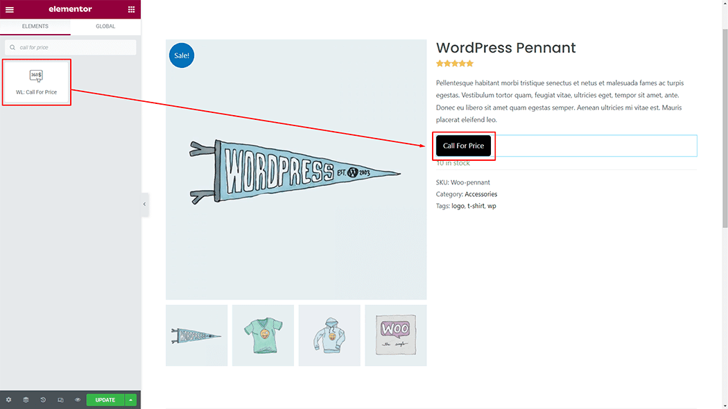 If you want to leverage the Call for Price feature on your WooCommerce store, you will need to use a widget named “Call for Price”. To do so, simply search the widget in the Elementor widget panel, and use it on the corresponding template that you have created for the Single Product Page.