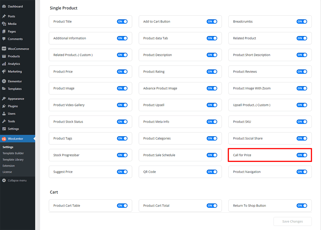 Go to WordPress Dashboard > WooLentor > Settings > Elements. From the list of Elements, turn ON the “Call for Price” widget.