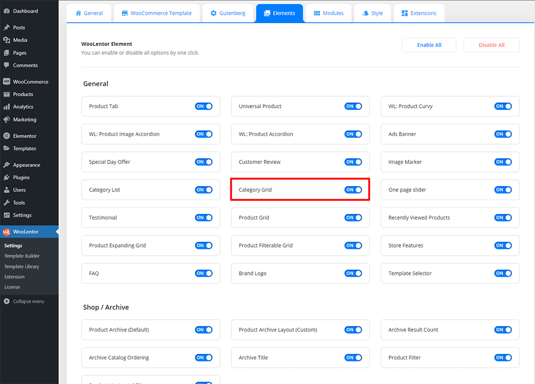 Go to Dashboard > WooLentor > Settings > Elements. From the list of Elements, turn ON the Category Grid widget.