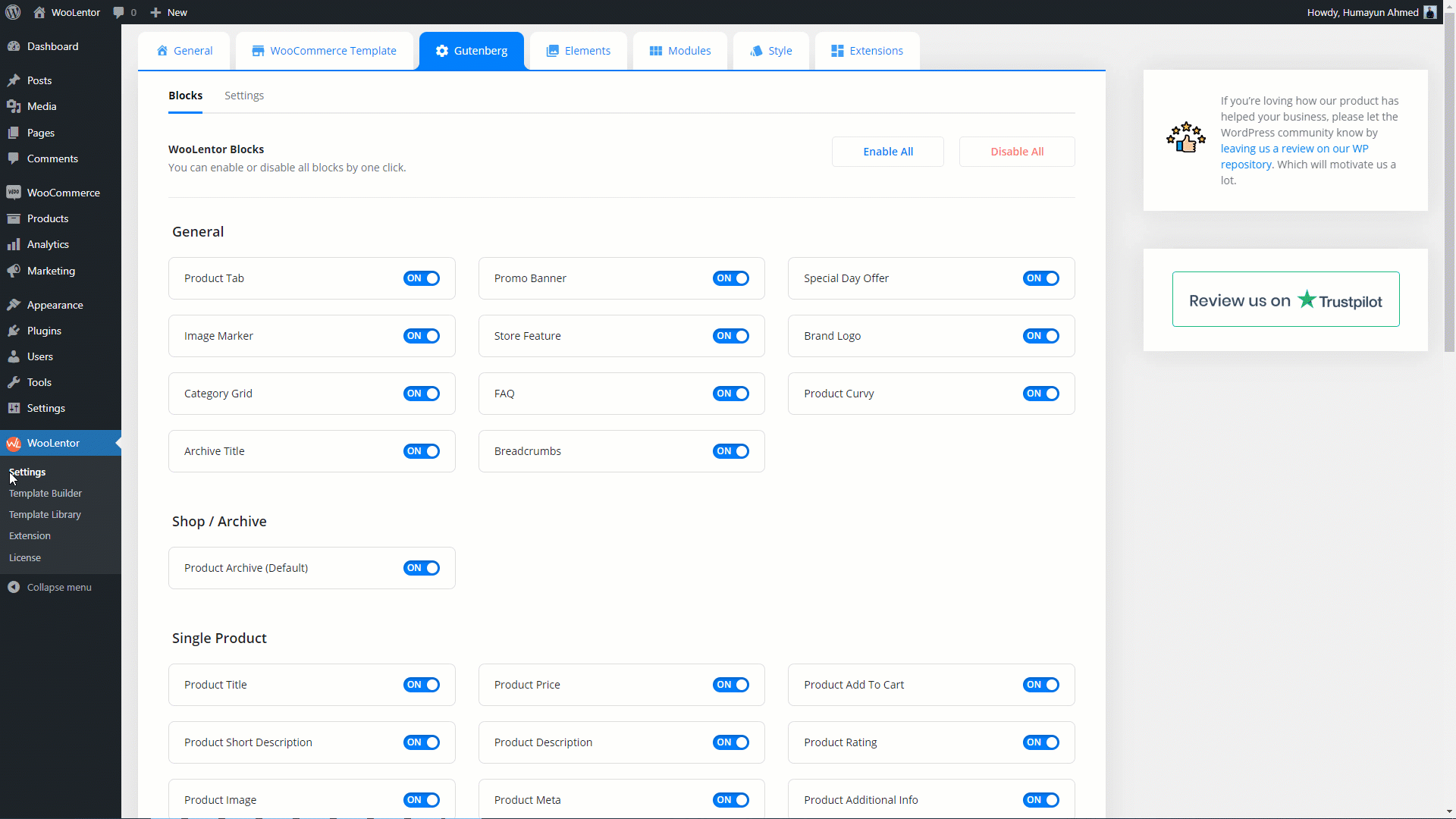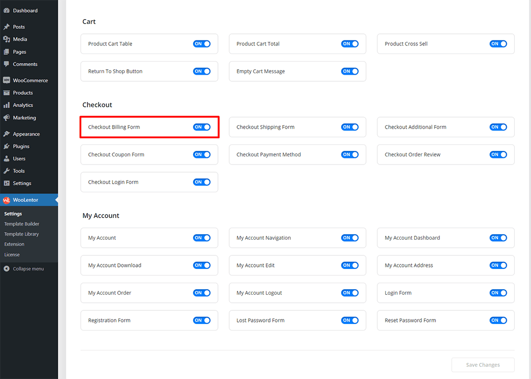 Go to Dashboard > WooLentor > Settings > Gutenberg. From the list of Gutenberg, turn ON the Checkout Billing Form Block.