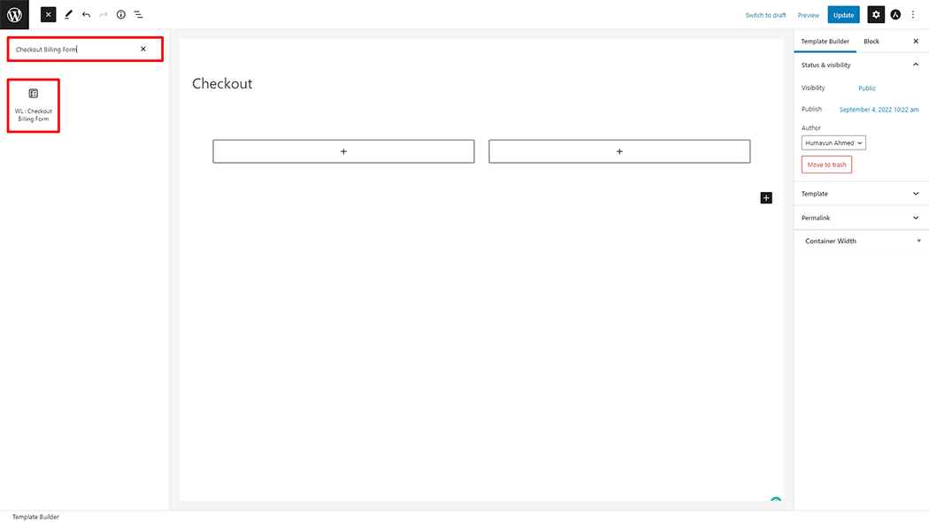 - To add a Checkout Billing Form Block, Drag and drop the “WL: Checkout Billing Form†Block onto the Checkout Page Template.
