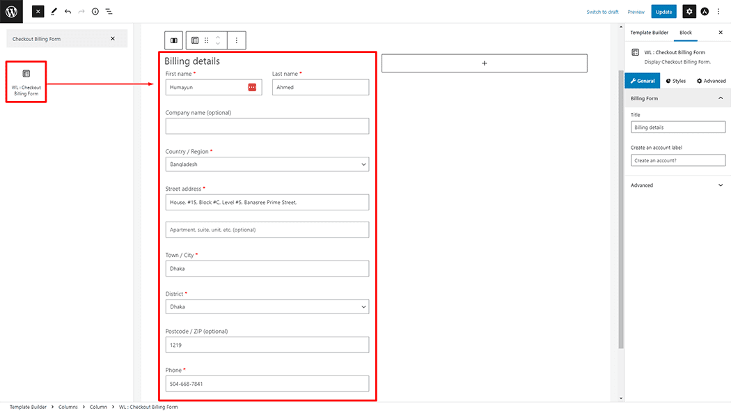 On the Checkout page, “WL: Checkout Billing Form” Block is used for the Checkout Billing Form on WooCommerce.