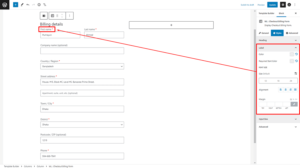 Label: You can change the Checkout Billing Form Label Color, Font Size, Alignment, and Margin style as you need