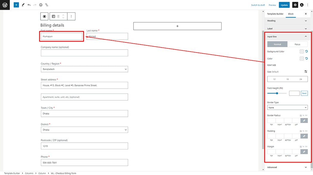 Input Box: You can change the Checkout Billing Form Input Box Background Color, Color, Font Size, Field Height, Border Type, Border Radius, padding and margin style as you need
