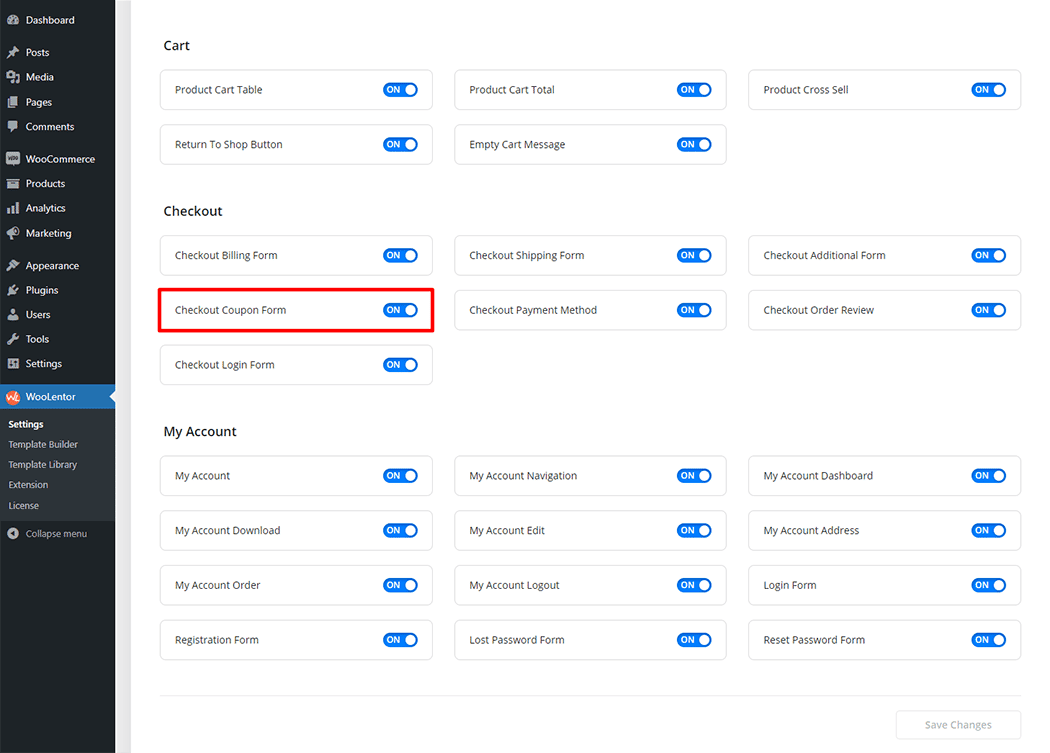 Go to Dashboard > WooLentor > Settings > Gutenberg. From the list of Gutenberg, turn ON the Checkout Coupon Form Block.