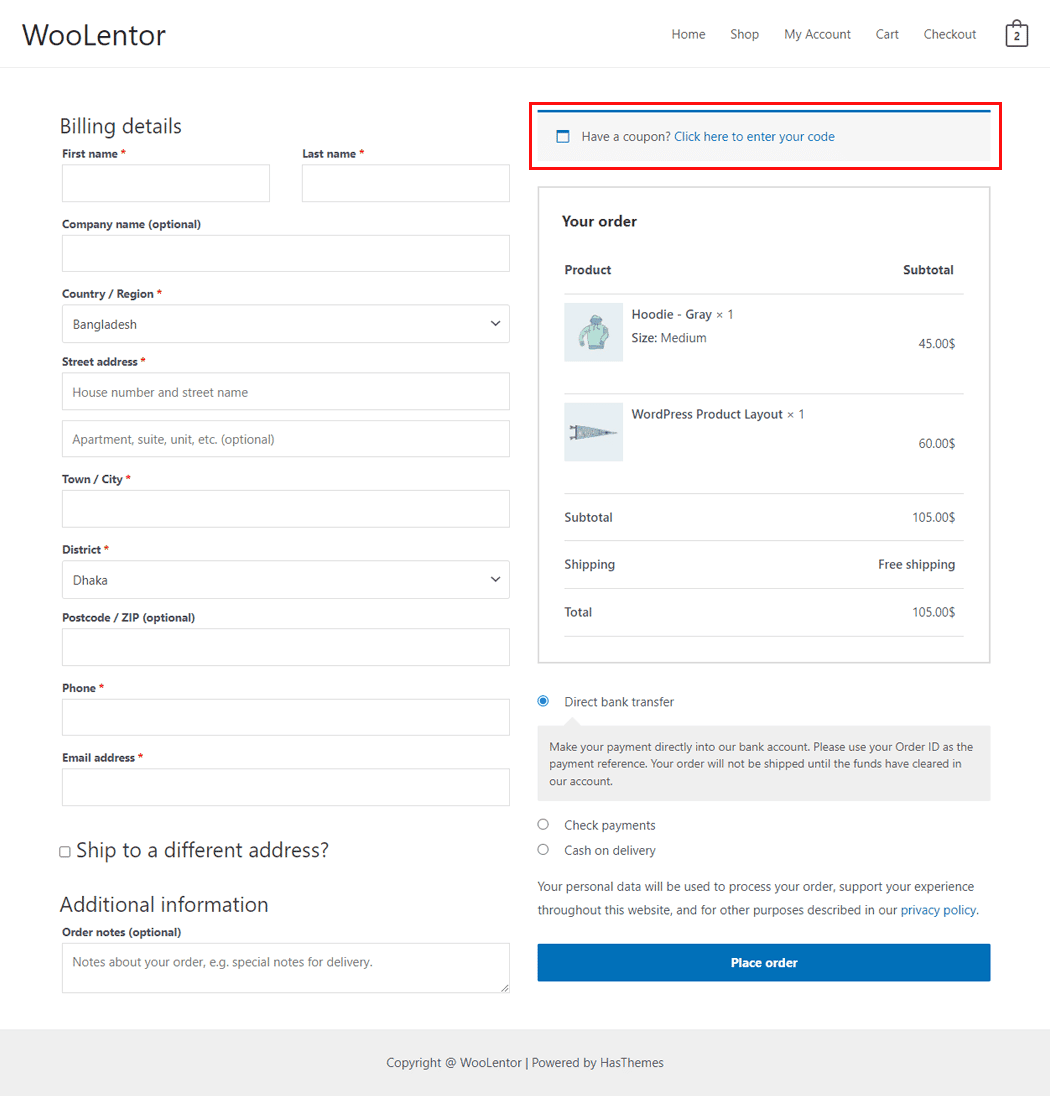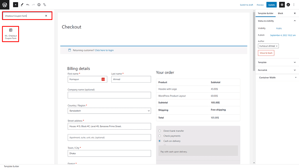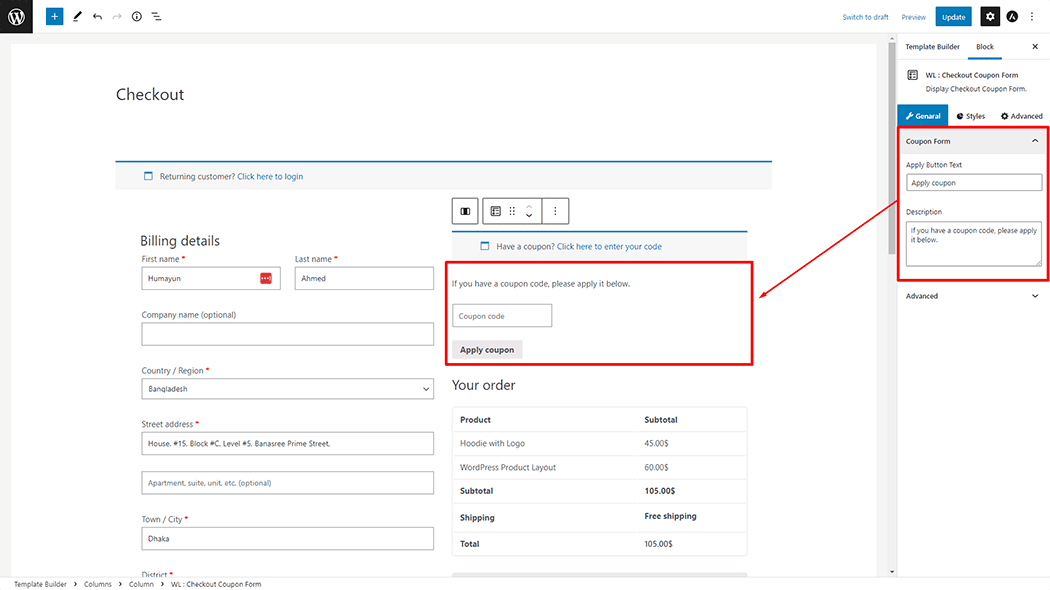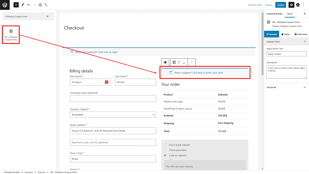 Drag and drop the WooLentor “Checkout Coupon Form” Block onto the Checkout page.