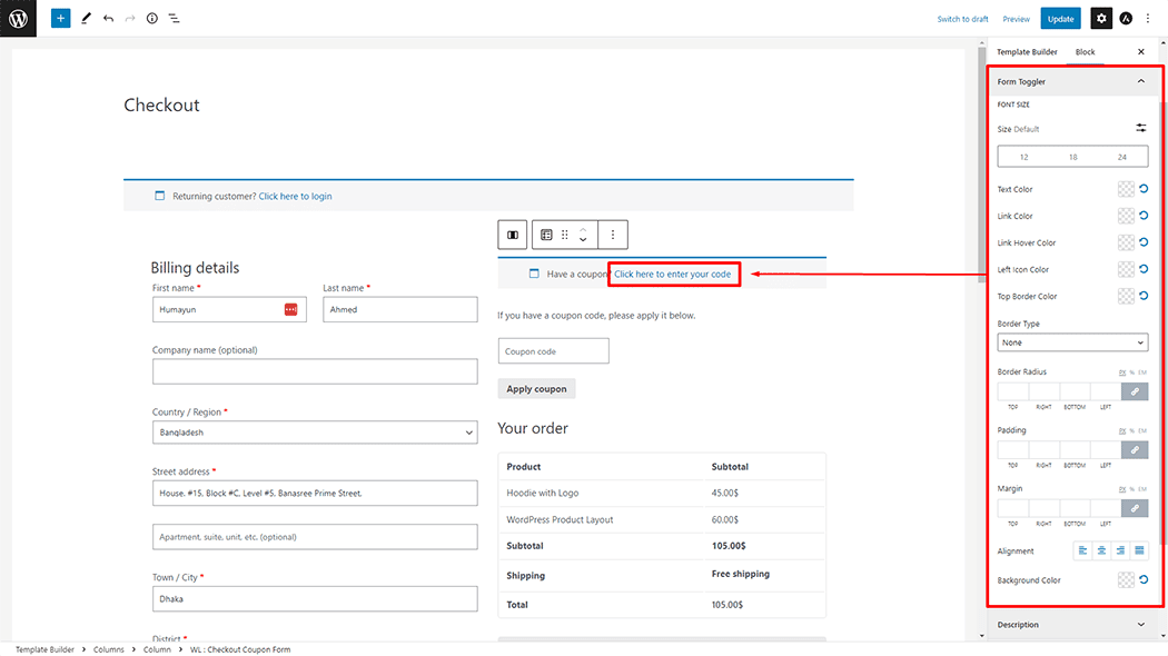 Form Toggler: You can change the Checkout Coupon Form Font Size, Text Color, Link Color, Left Icon Color, Top Border Color, Border Type, Padding, Margin, Alignment, and Background Color style as you need