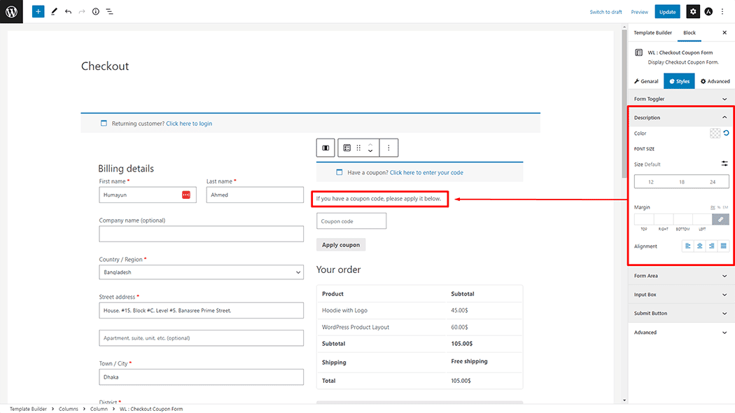 Description: You can change the Checkout Coupon Form form Color, Font Size, Margin, and Alignment style as you need