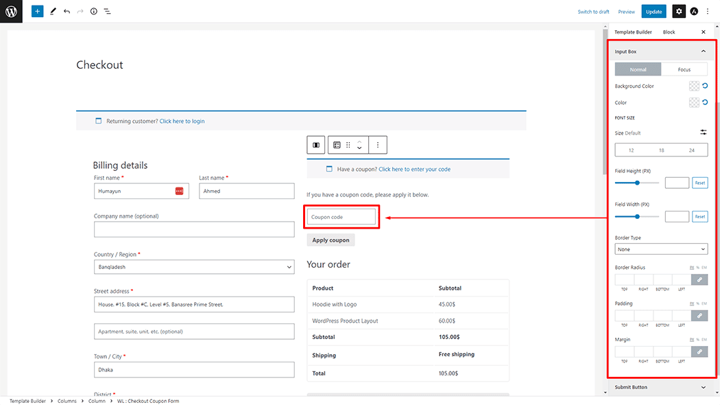 Input Box: You can change the Checkout Coupon Form Input Box Background Color, Color, Font Size, Feild Height, Border Type, Border Radius, Padding and Margin style as you need