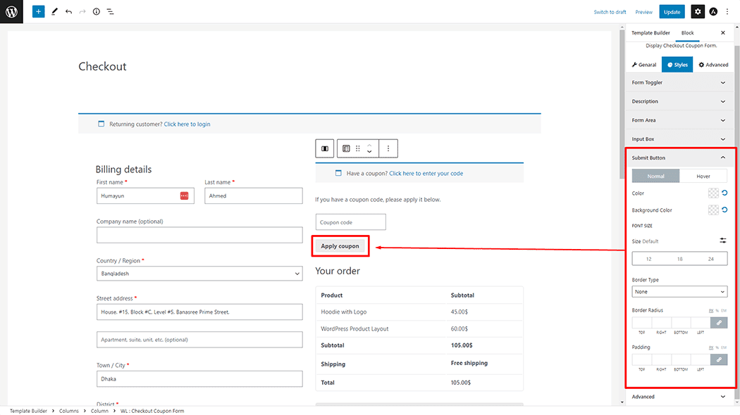 Submit Button: You can change the Checkout Coupon Form Place Submit Button Color, Background Color, Font Size, Border Type, Border Radius, and Padding style as you need