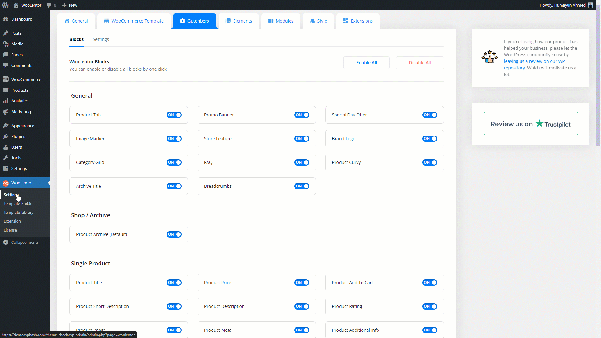 Go to WordPress Dashboard > WooLentor > Settings > Gutenberg. From the list of Gutenberg, turn ON the “Checkout Coupon Form” Block.
