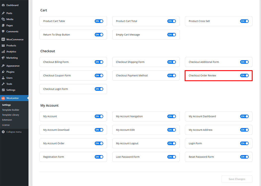 Go to Dashboard > WooLentor > Settings > Gutenberg. From the list of Gutenberg, turn ON the Checkout Order Review Block.