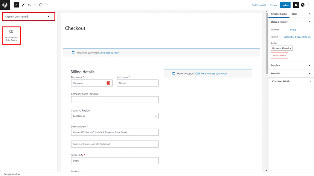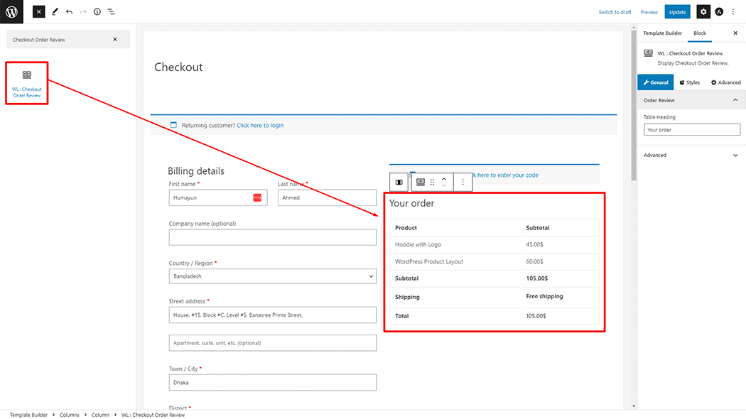 - To add a Checkout Order Review Block, Drag and drop the “WL: Checkout Order Review†Block onto the Checkout Page Template.