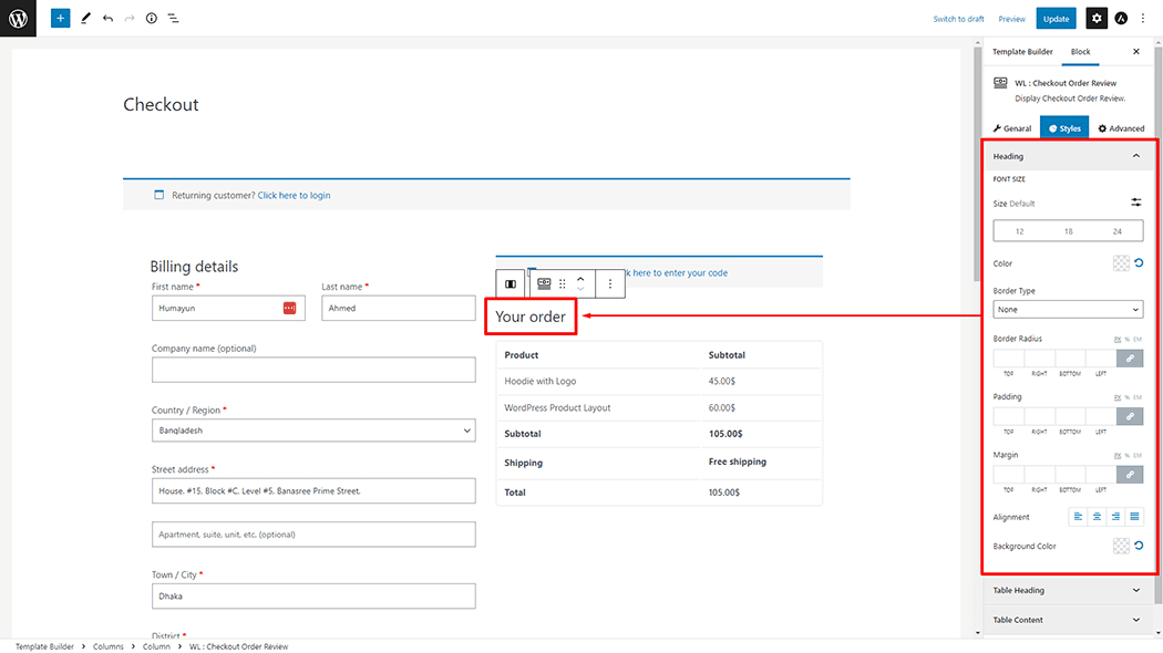 Heading: You can change the Checkout Order Review Heading Font Size, Color, Border Type, Border Radius, Padding, Margin, Alignment, and Background Color style as you need