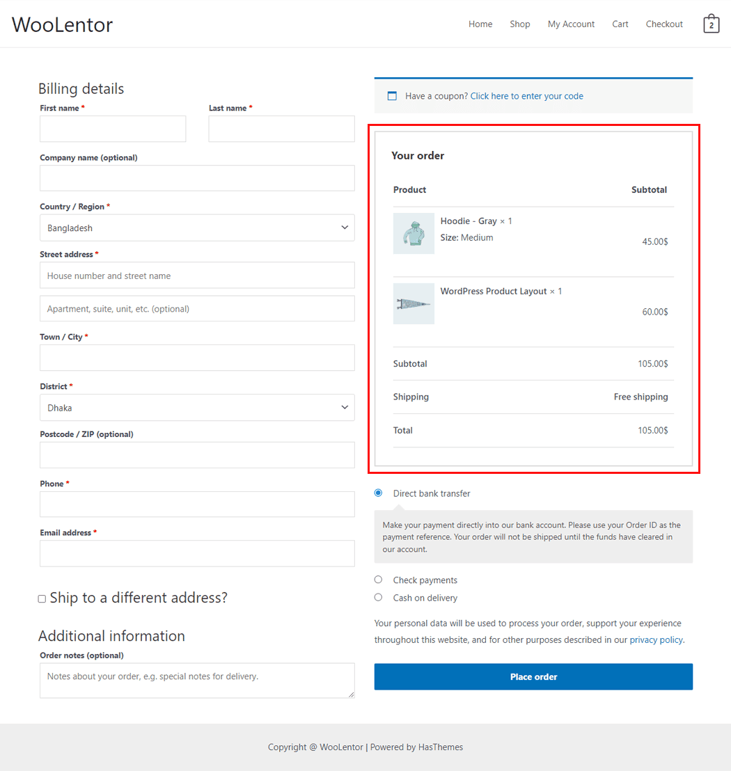 Drag and drop the WooLentor “Checkout Order Review†Block onto the Checkout page.