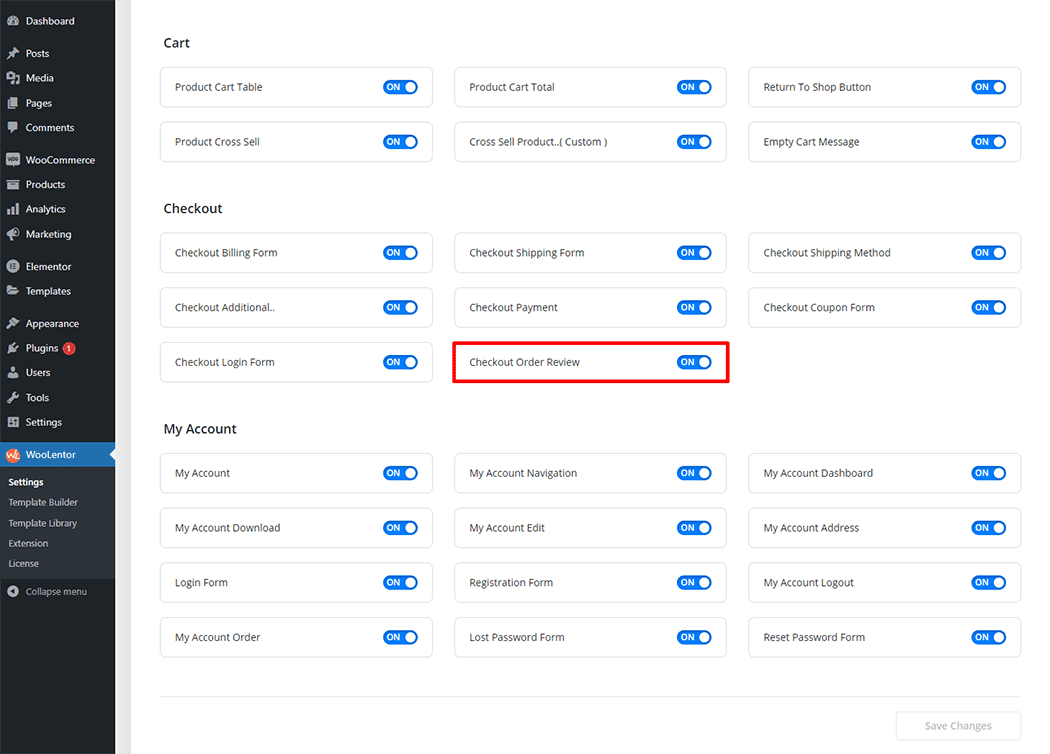 Go to WordPress Dashboard > WooLentor > Settings > Elements. From the list of Elements, turn ON the “Checkout Order Review” widget.