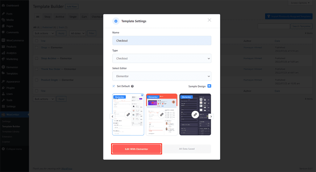 First, set the name of your Template and select it in the popup box for template settings. Select the Single from the dropdown type list. Then select the editor. Here there are two options- Elementor and Gutenburg. After that, choose your preferred template from the available ones. Once you are done You can choose a default sample design from the “Sample Design†button and save the settings by clicking the Save Settings button.
