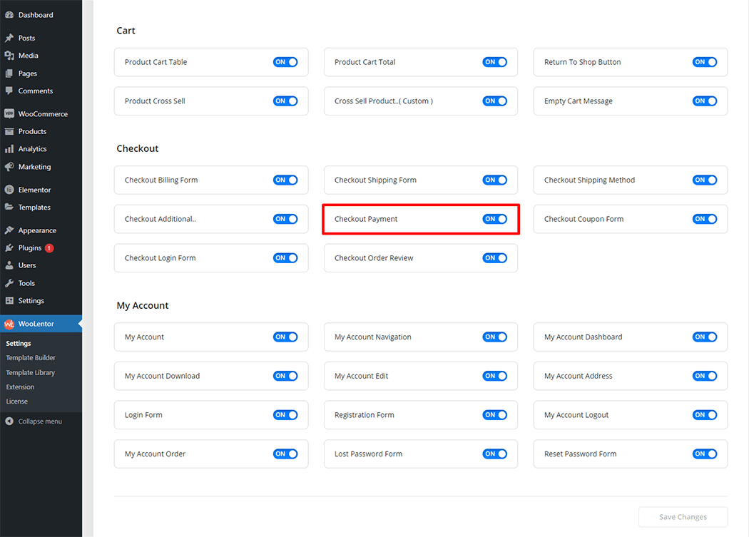 Go to WordPress Dashboard > WooLentor > Settings > Elements. From the list of Elements, turn ON the “Checkout Payment Method” widget.