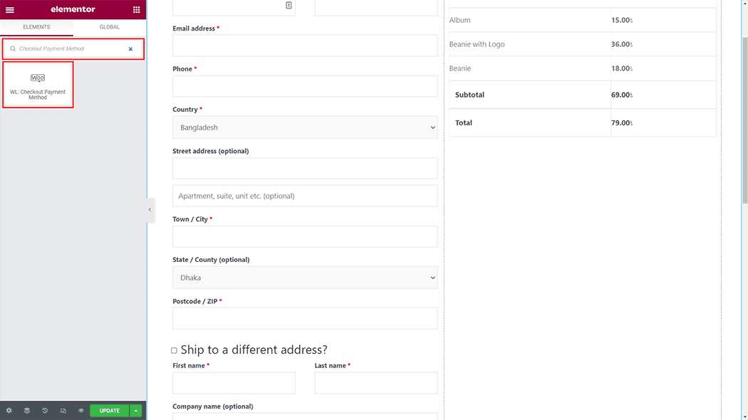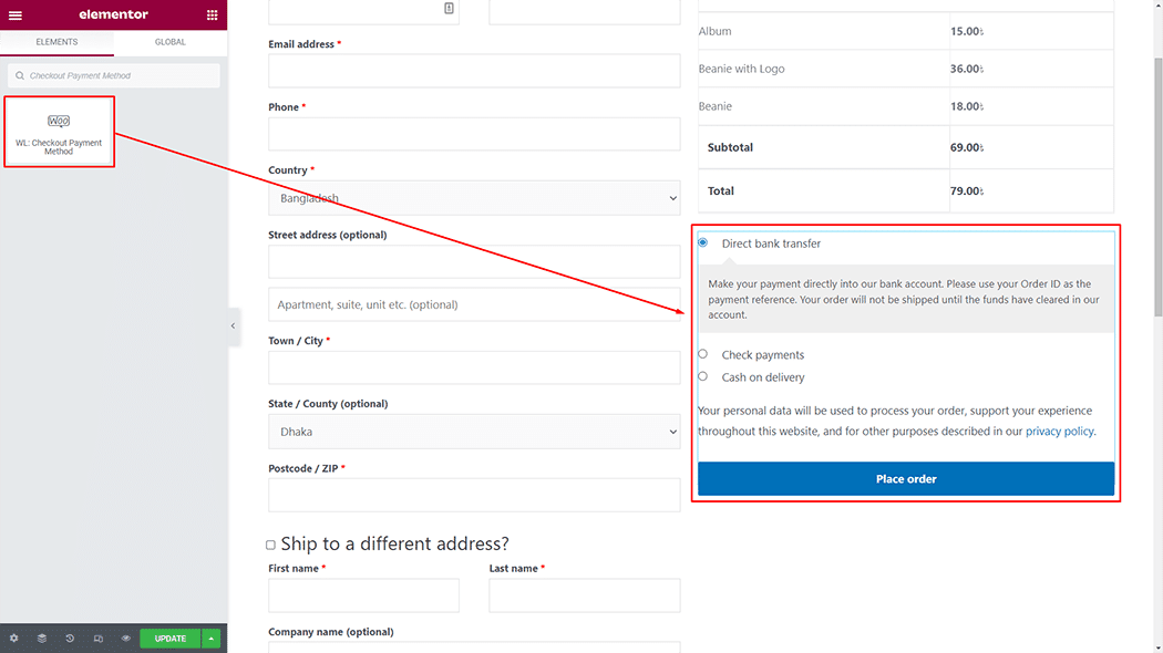Drag and drop the WooLentor “Checkout Payment Method†widget onto the Checkout page.