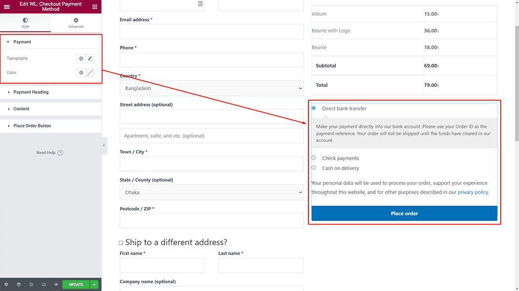 Payment: You can change the Checkout Payment Method payment style as you need