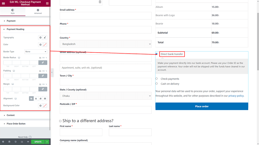 Heading: You can change the Checkout Payment Method Heading style as you need