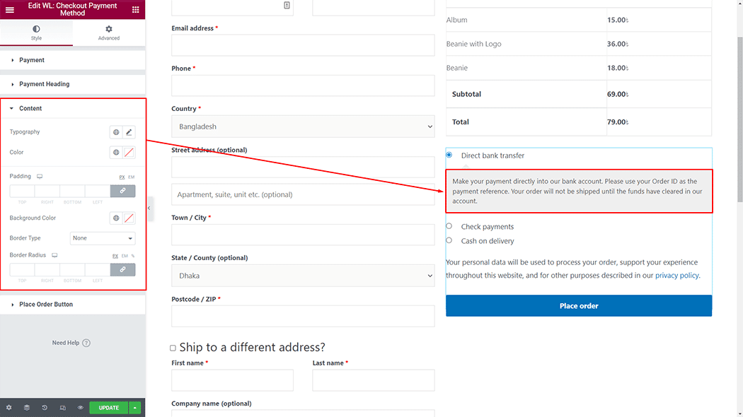 Content: You can change the Checkout Payment Method Content style as you need