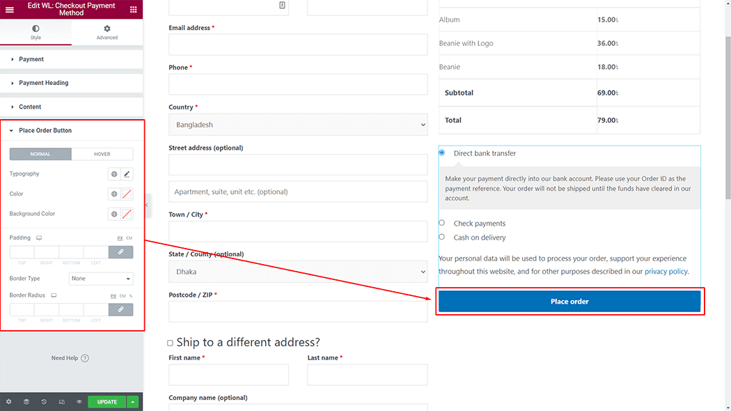 Place Order Button: You can change the Checkout Payment Method Place Order Button style as you need
