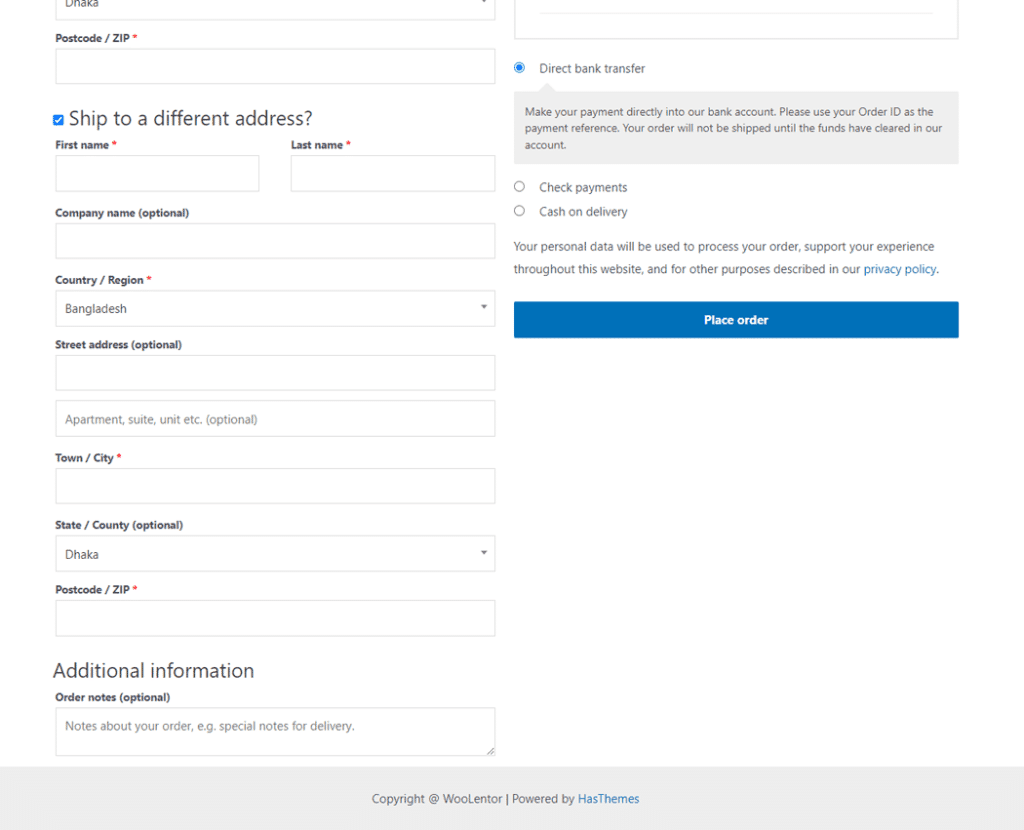 The “Checkout Payment Method†widget of WooLentor enables you to display all the payment methods configured in the WooCommerce settings on the Checkout page. This widget will make the Checkout process a lot easier for your customers as it provides them with a variety of payment options to choose from.