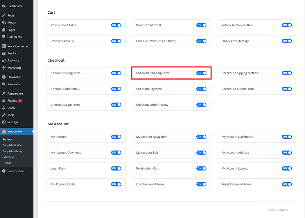 Go to WordPress Dashboard > WooLentor > Settings > Elements. From the list of Elements, turn ON the “Checkout Shipping Form” widget.