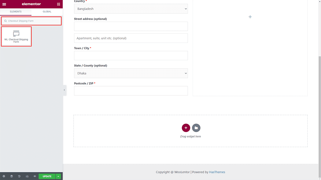 Drag and drop the WooLentor “Checkout Shipping Form” widget onto the Checkout Page Template.