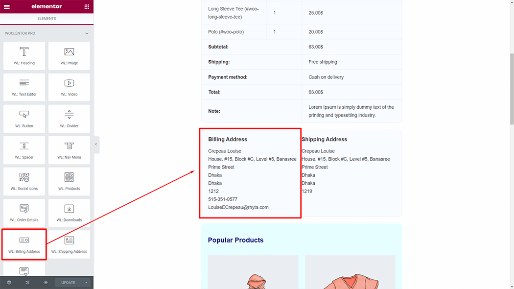 WL: Billing Address – This is a Billing Address widget. With this widget, you can show the billing address on your email template.