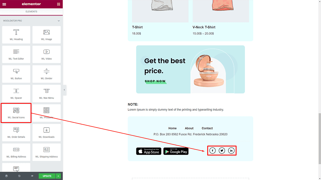 WL: Social Icons – This is a Social Icons widget. The store owner can add social media icons and add links to social media to their email template.
