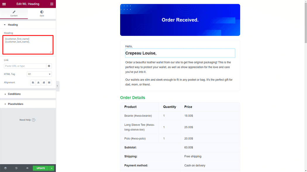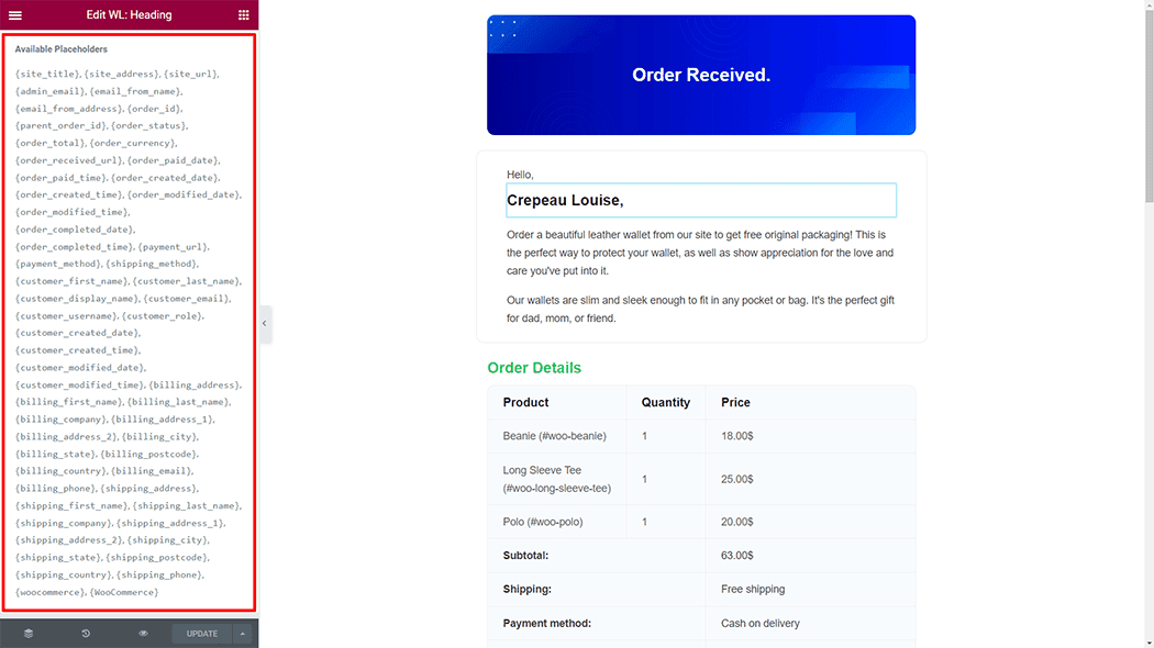 There are available all the necessary Placeholders to display dynamic data like order info, customer info, billing info, shipping info, etc. You can use these available Placeholders supported text anywhere.
