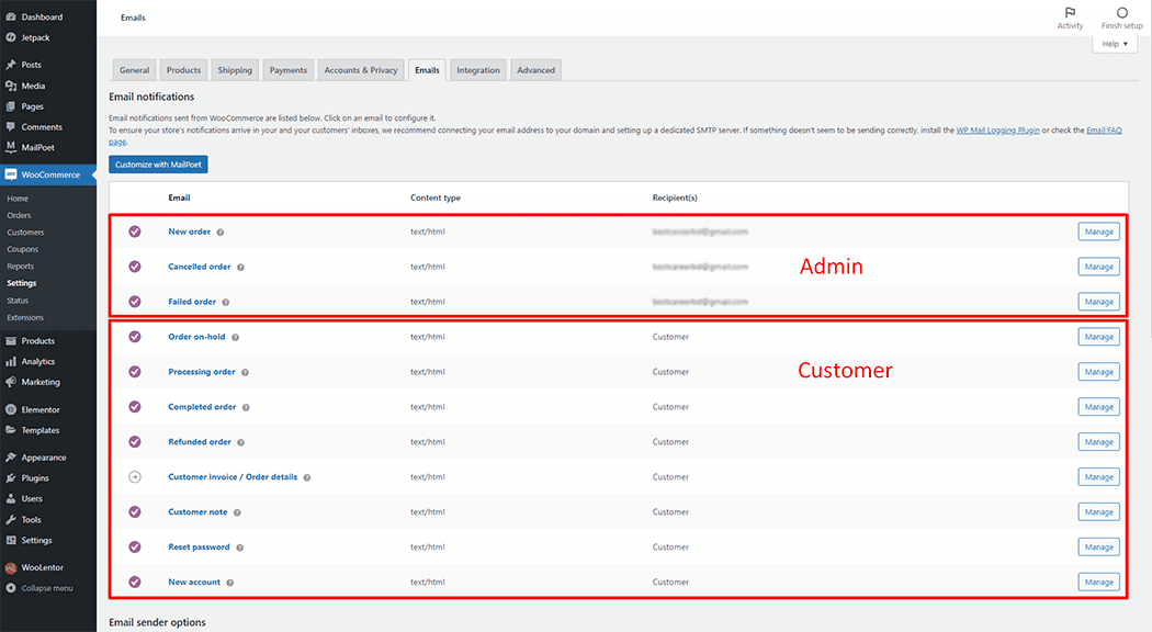 | Customer note | Customer | Send to the customer when a customer note is added from the edit order admin. |