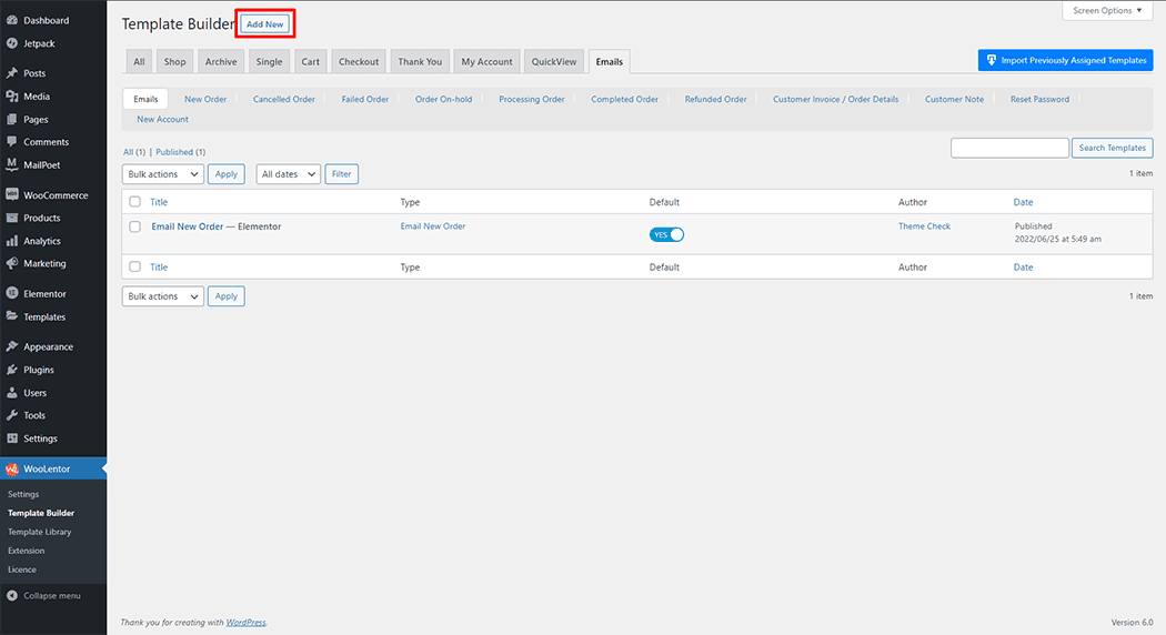 Go to Dashboard > WooLentor > Template Builder. Click the Add New button on the top right beside the text Template Builder to create custom Email Templates to override and customize WooCommerce Email Templates.