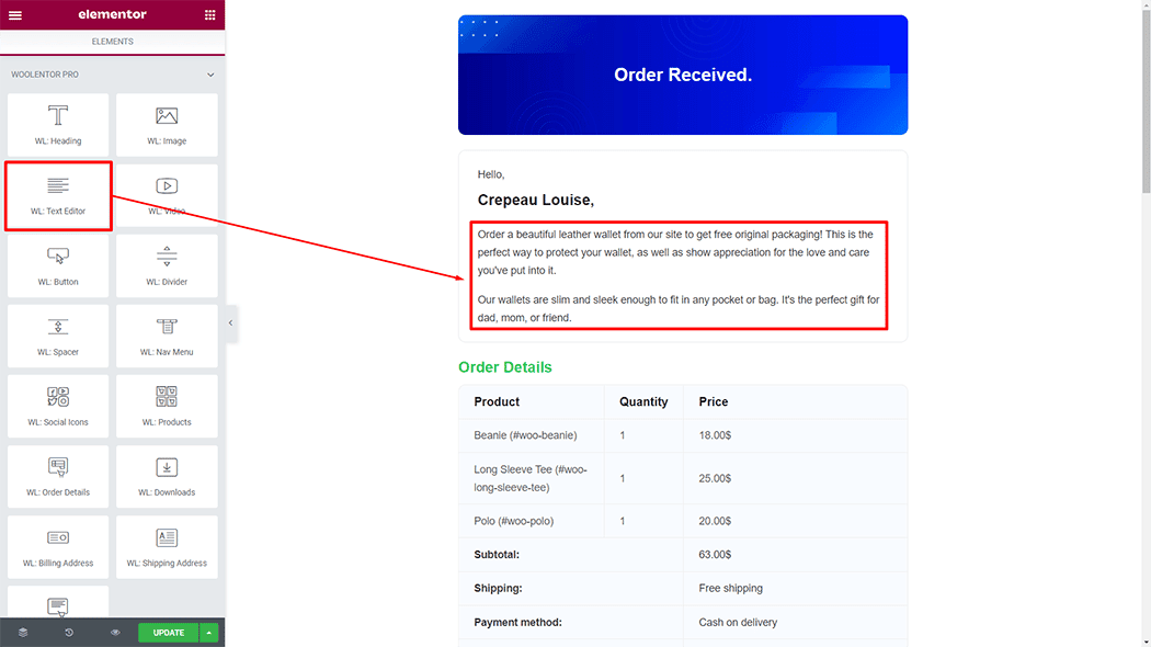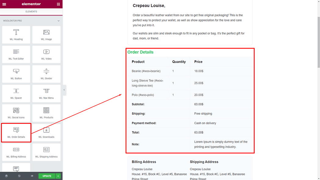 WL: Order Details – This is an Order Details widget. With this widget, you can show order details on your email template.