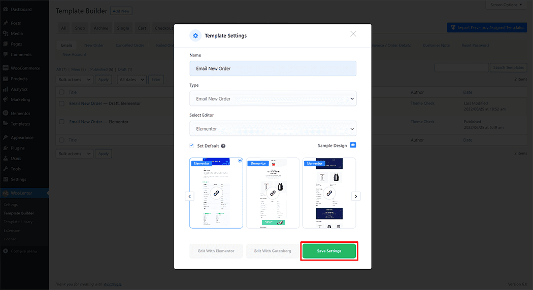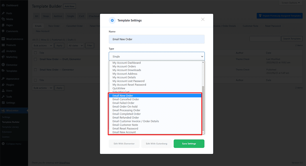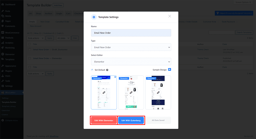 To edit the created Email Template, click the “Edit with Elementor” or “Edit with Gutenberg” button.