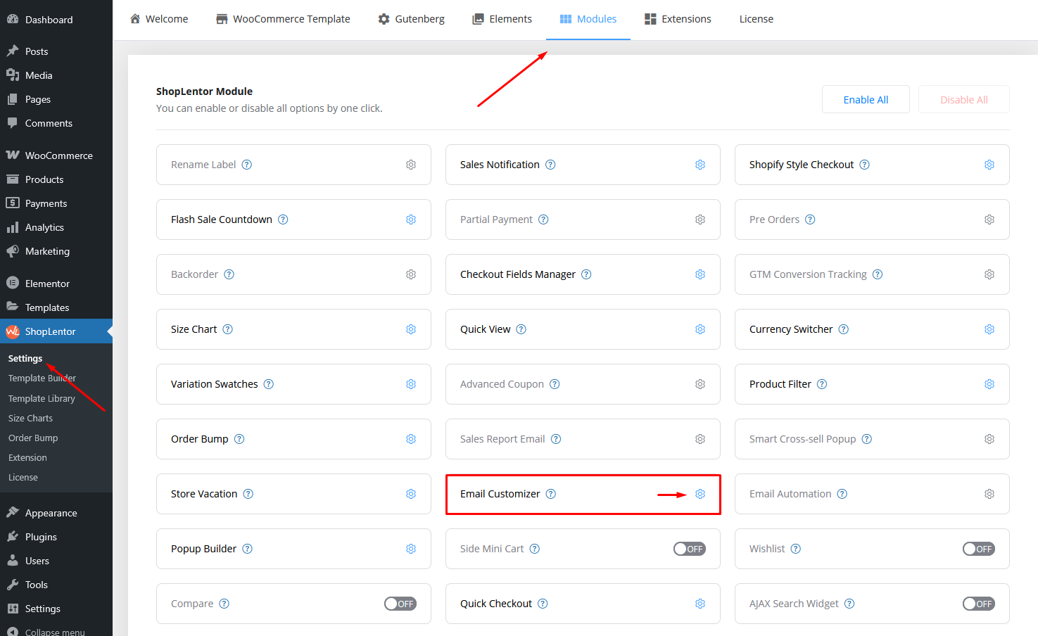 Go to WordPress Dashboard > WooLentor > Settings > Modules. From the list of Modules, turn ON the “Email Customizer” Module.