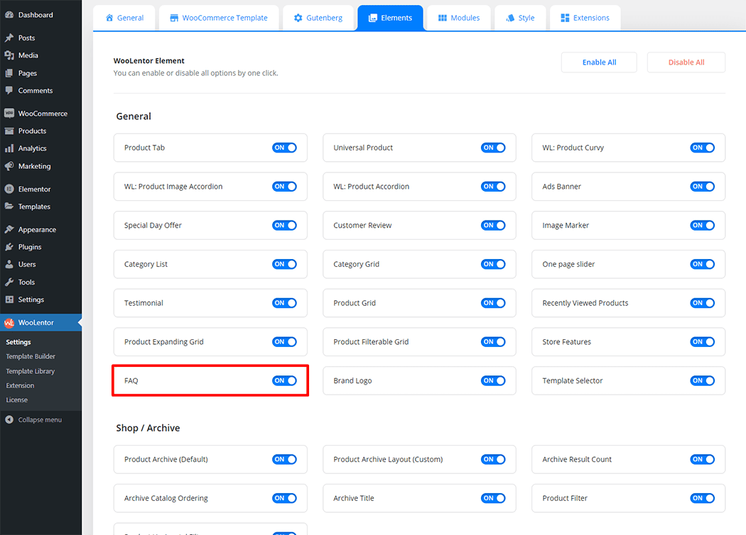 Go to Dashboard > WooLentor > Settings > Elements. From the list of Elements, turn ON the Faq widget.