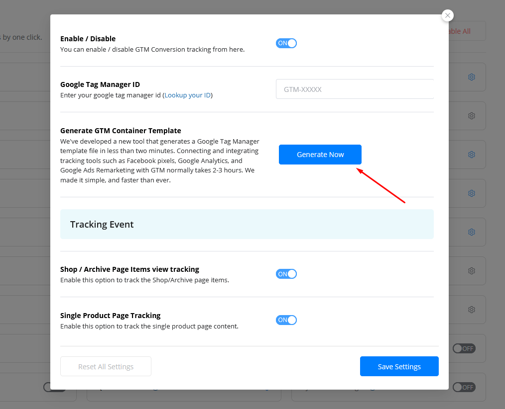 Click Generate Now button to Generate GTM Container Template
