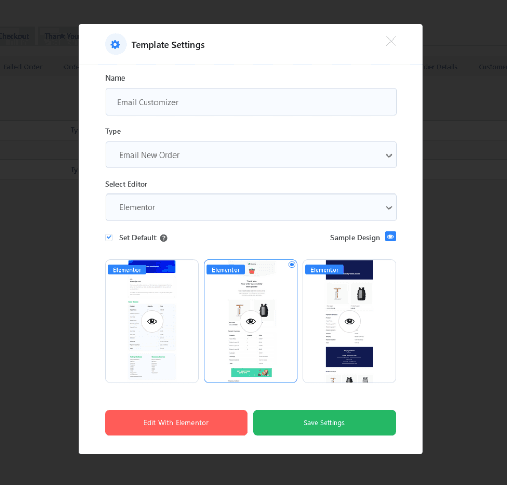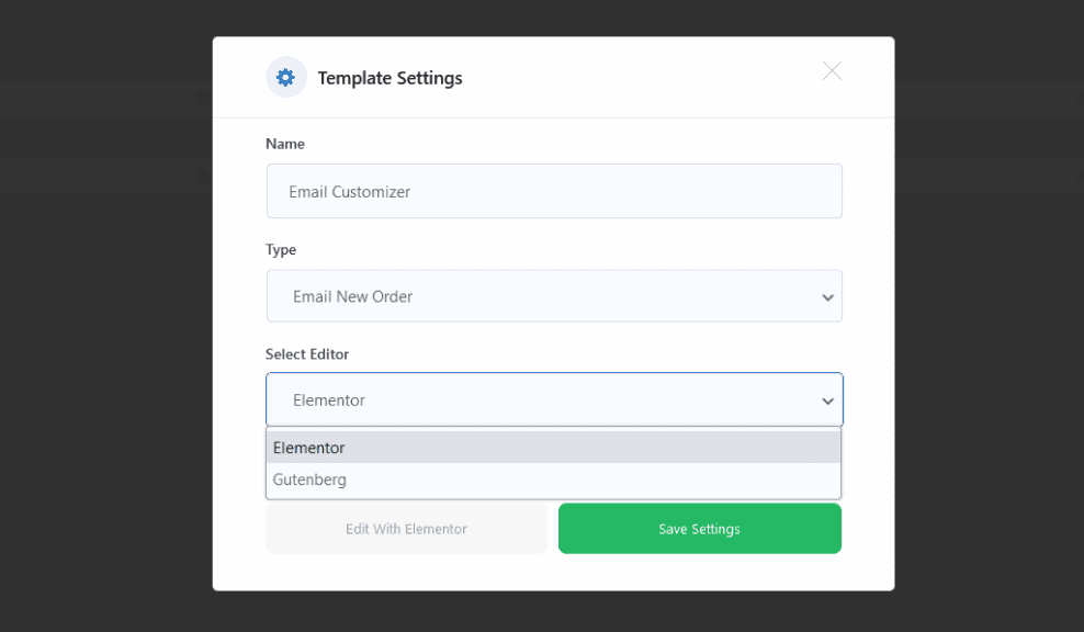 To modify the generated Email Template, click the “Edit with Elementor” or “Edit with Gutenberg” button.