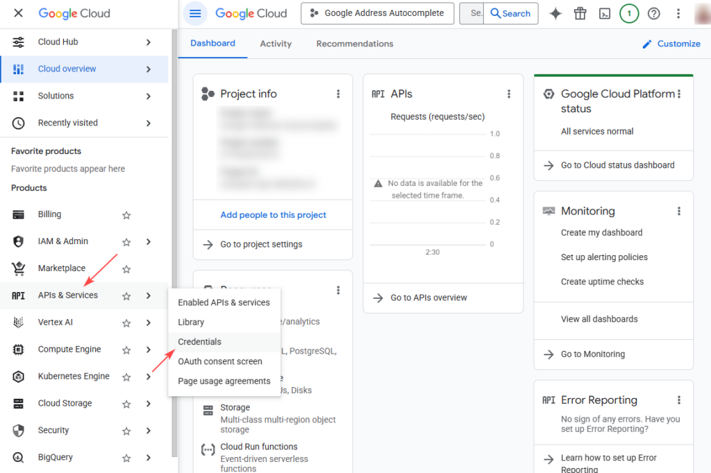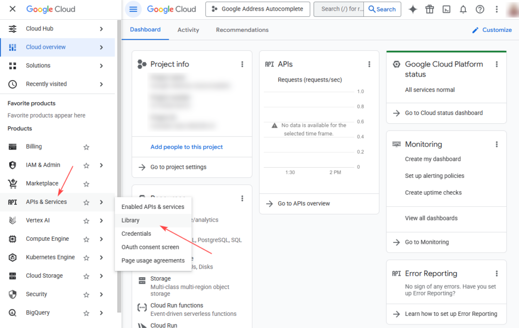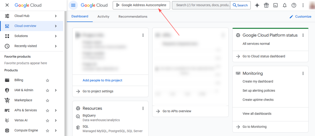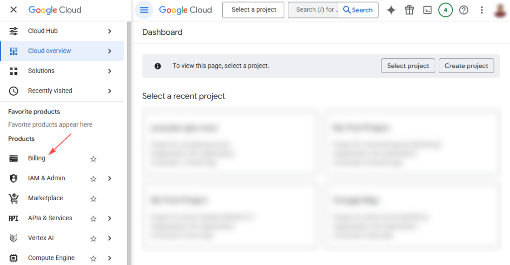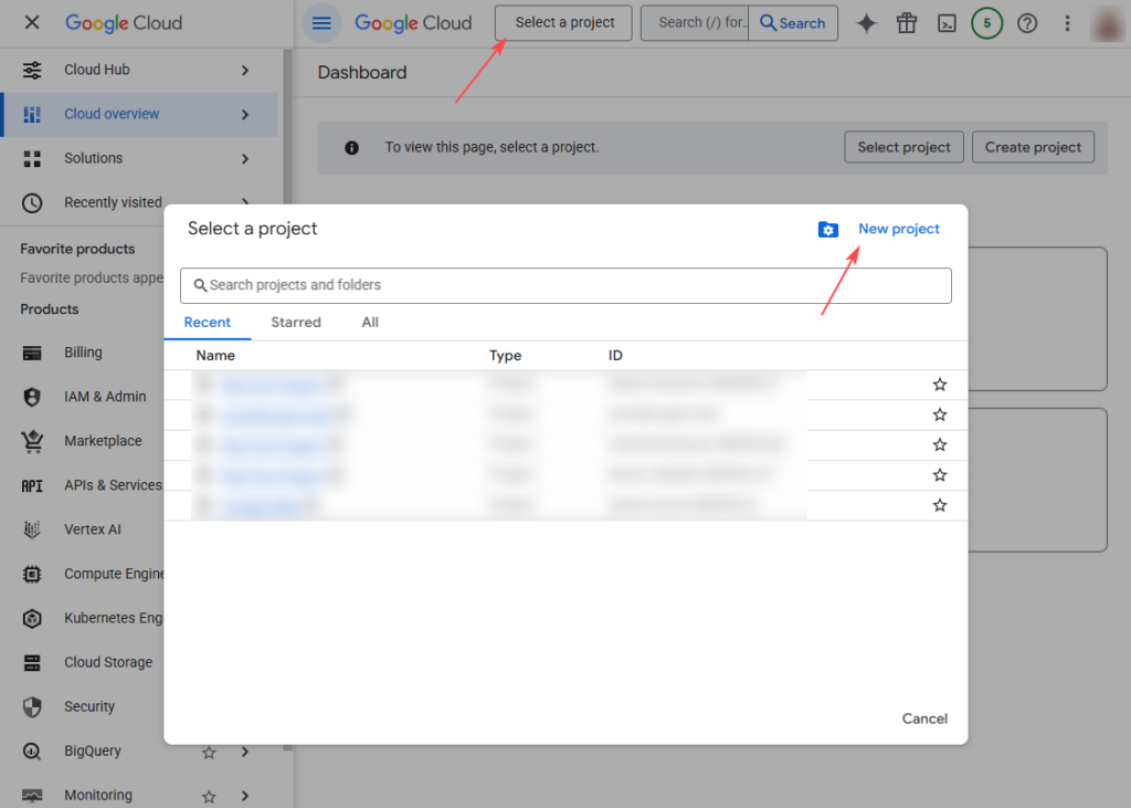 - In the Google Cloud Console, select “Select a Project” from the top bar.