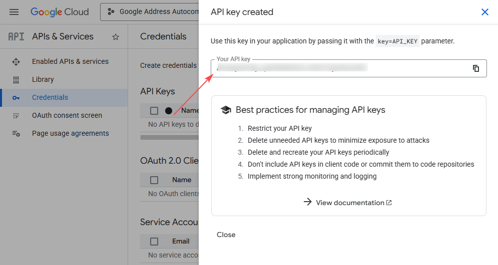 - Copy your API key. You will use this in the Google Address Autocomplete module in ShopLentor.