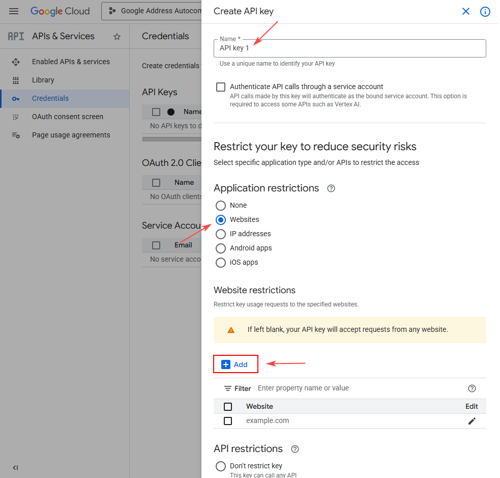 - A new key will be generated. Make sure to restrict the key by adding your store’s domain to prevent unauthorized access.