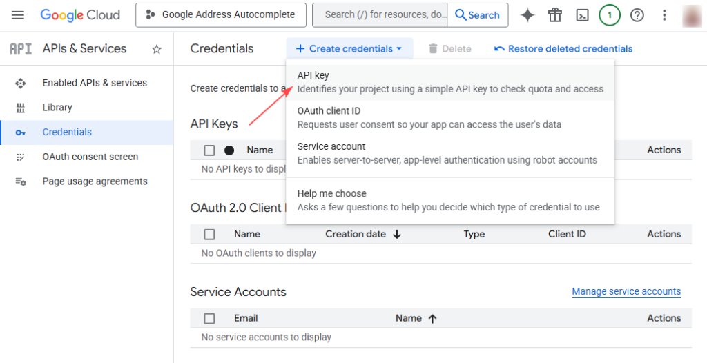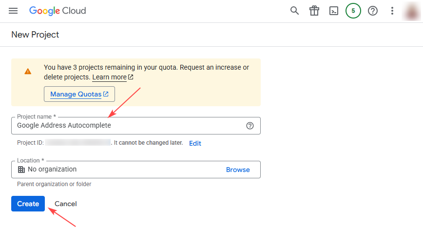 - Click “New Project”, name it something like “Google Address Autocomplete”, and click Create.